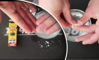 Μετά από αυτό, μπορείτε να βουτήξετε τα χέρια σας στο διάλυμα που προκύπτει ή να εμποτίσετε βαμβακερούς δίσκους σε αυτό και να αρχίσετε να καθαρίζετε τα δάχτυλά σας. Μια γυναίκα δείχνει πώς όλες οι καφέ κηλίδες εξαφανίζονται μέσα σε λίγα δευτερόλεπτα.