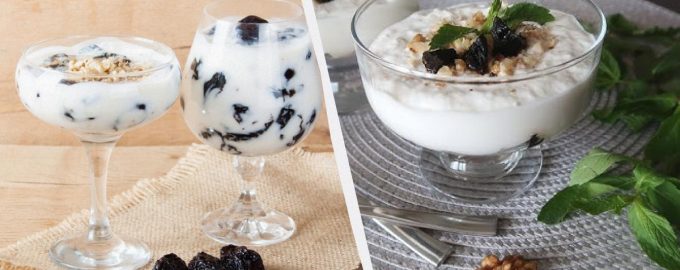 Ο νόστιμος συνδυασμός της ξινή κρέμας και των δαμάσκηνων θα κερδίσει τους πάντες. Επιδόρπιο με δαμάσκηνα και ξηρούς καρπούς βασιλικό / κολάζ My, φωτογραφία depositphotos.